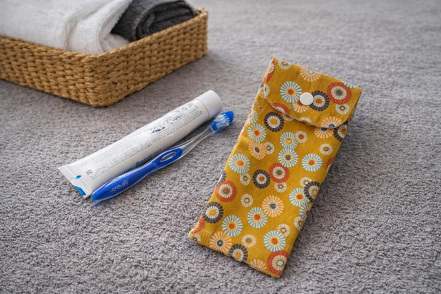 Découvrez notre étui de voyage fait main couleur extérieur imprimé japonais jaune moutarde, spécialement conçu pour accueillir votre brosse à dents et dentifrice.