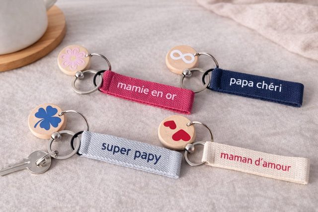 Offrez un cadeau unique et plein d’émotion avec ces porte-clés personnalisés en bois et tissu, parfaits pour célébrer ceux que vous aimez. Chaque porte-clé est composé d’un médaillon rond en bois naturel, décoré d’un motif délicat (cœur, fleur, trèfle, symbole infini…), associé à une sangle textile personnalisée avec un message tendre comme maman d’amour, papa chéri, mamie en or ou super papy.