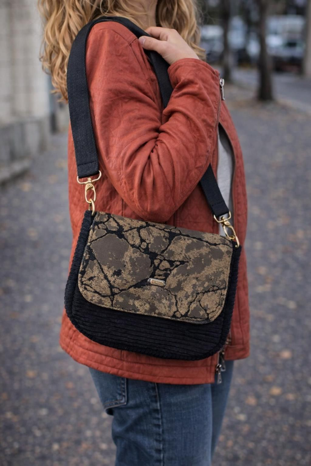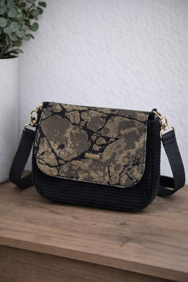 Laissez-vous séduire par le sac Éclat Marbré, une pièce unique qui allie style et praticité. Son tissu texturé aux motifs minéraux évoque l’élégance naturelle de la pierre, tandis que sa base en velours côtelé noir apporte une touche de douceur et de caractère. Sa bandoulière large et réglable assure un confort optimal au quotidien. À l’intérieur, une poche zippée permet de garder vos petits essentiels en sécurité. Parfait pour accompagner vos tenues urbaines ou casual chic, ce sac est l’allié idéal pour affirmer votre style avec originalité.