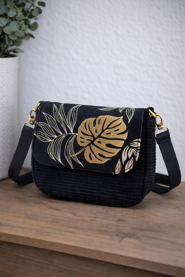 Son tissu aux motifs de feuilles tropicales dans des tons noirs, dorés et blancs s’associe à un velours côtelé noir qui lui donne une allure chic et originale.