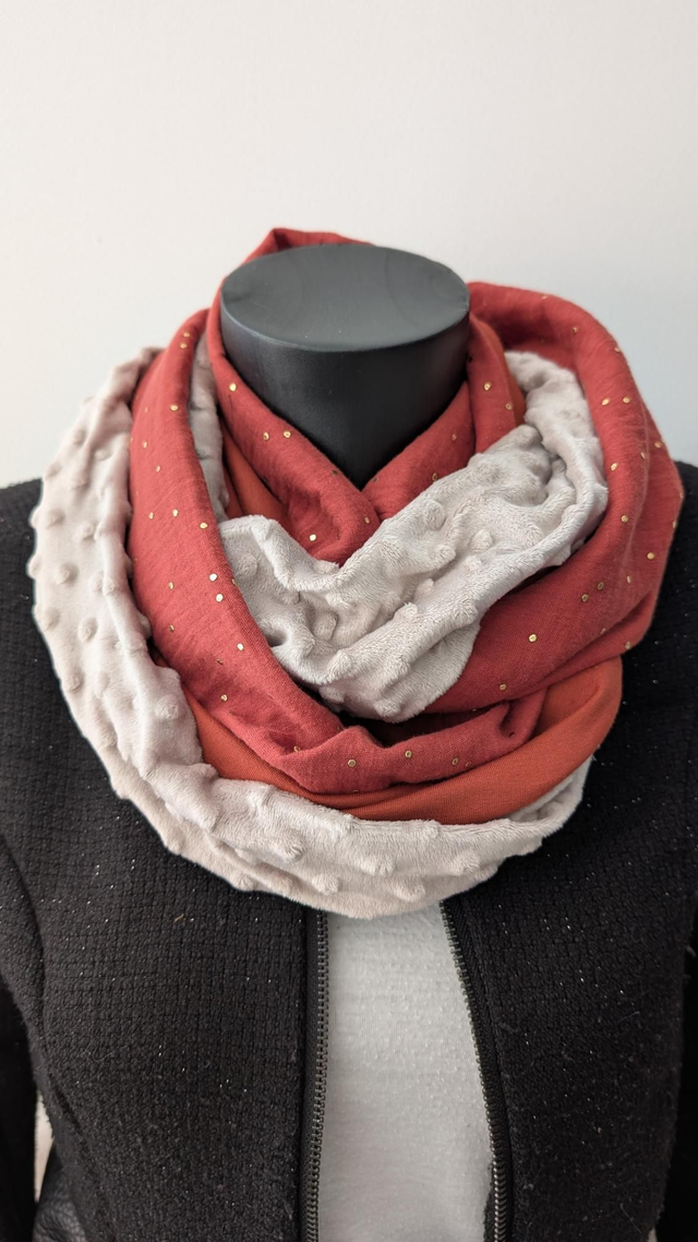 Optez pour ce tour de cou artisanal mêlant jersey terracotta, minky crème ultra-doux et double gaze terracotta à pois dorés. Ses trois textures et couleurs harmonieuses offrent un confort unique : le jersey apporte souplesse, le minky procure une chaleur cocooning et la double gaze ajoute une touche lumineuse grâce à ses petits pois dorés. Facile à enfiler, il reste bien en place sans serrer. Idéal pour l’automne, l’hiver et les journées fraîches. Un accessoire tendance, fait main, parfait pour sublimer un manteau, une veste ou un look casual.