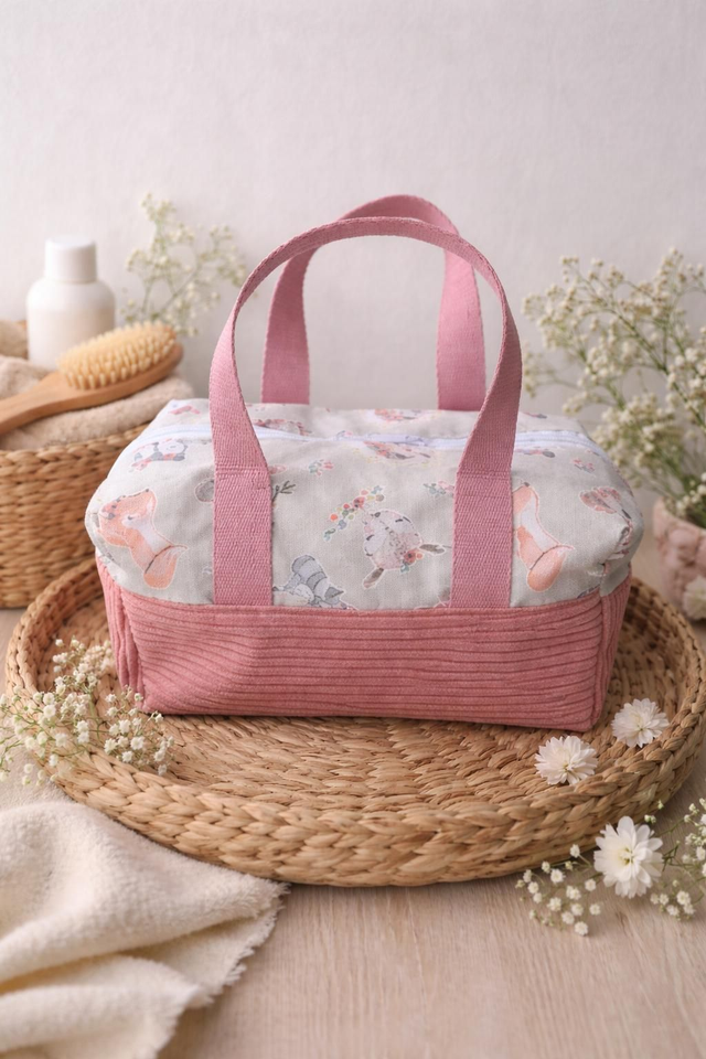 La base en tissu côtelé rose apporte à la fois style et robustesse, tandis que les anses solides permettent un transport facile.