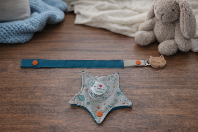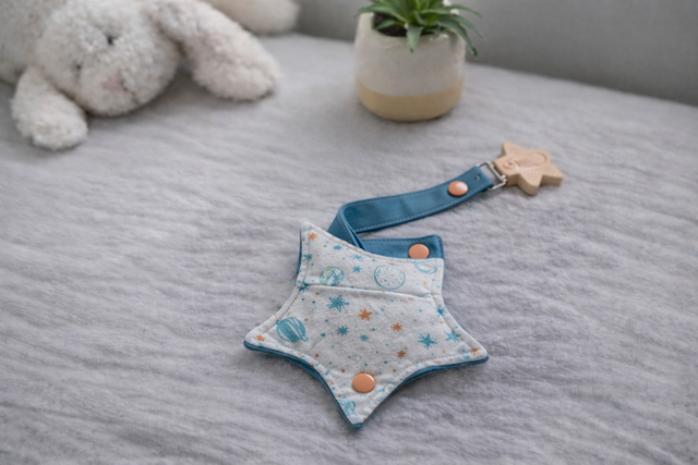 Optez pour notre attache tétine avec pochette de rangement en forme d’étoile, l’accessoire indispensable pour bébé.