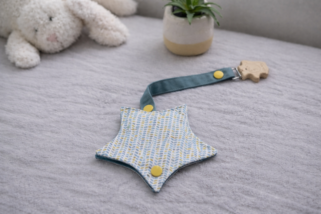 Optez pour notre attache tétine avec pochette de rangement en forme d’étoile, l’accessoire indispensable pour bébé.